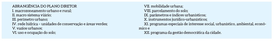O Estatuto das Cidades (Lei Federal nº 10.257/2001), que foi a lei que regulamentou a obrigatoriedade de os municípios com mais de 20 mil habitantes terem o plano diretor, é mais modesta e conta com 58 artigos.