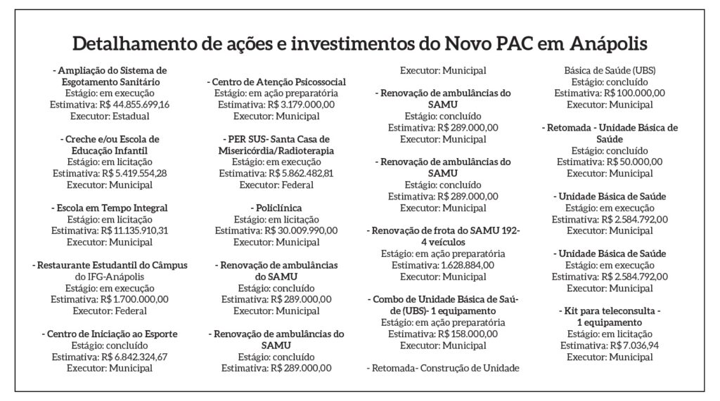 Em Anápolis, o Novo PAC, conforme levantamento realizado pelo Jornal CONTEXTO no site do programa, que é coordenado pela Casa Civil, está movimentando mais de R$ 117 milhões. Mais precisamente: 11milhões, 274 mil, 466 reais e 17 centavos.