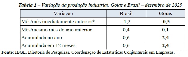 Mas, vamos aos números. Segundo o IBGE, a produção industrial de Goiás encolheu em dezembro, na comparação com novembro. O recuo foi de -0,5%. No Brasil, na mesma comparação, a queda foi de -1,2%.