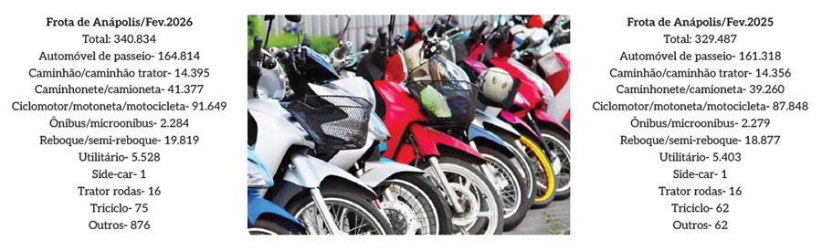 Os veículos de duas rodas (ciclomotor, motoneta e motocicleta) já são mais de 90 mil na frota de emplacados em Anápolis, segundo estatística da Secretaria Nacional de Trânsito (Senatran), referente ao mês de fevereiro/2026.